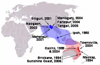 | July 2007 | Clifton Beach, Cairns, Queensland | Infection of one horse (euthanised).[36] | ||