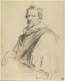 Anthony van Dyck made a few portraits of his master: a black chalk drawing (1627 – 1632, J. Paul Getty Museum), which is a study for van Dyck's The Iconography, a series of prints of famous people, and two grisaille oil sketches (c. 1630, Boughton House, Northamptonshire, UK; and 1634–1635, private collection).[7][8][9]