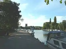 Henley Bridge is a five arched bridge across the river built in 1786. It is a Grade I listed historic structure. During 2011 the bridge underwent a £200,000 repair programme after being hit by the boat Crazy Love in August 2010.[7] About 1 mile (1.5 kilometres) upstream of the bridge is Marsh Lock.[8] Henley Town Hall, which maintains a prominent position in the Market Place, was designed by Henry Hare and completed in 1900.[9] Chantry House is the second Grade I listed building in the town. It is unusual in having more storeys on one side than on the other.[10] The Church of England parish church of St Mary the Virgin is nearby and has a 16th-century tower.[11][12] The Old Bell is a pub in the centre of Henley on Bell Street. The building has been dated from 1325: the oldest-dated building in the town.[13] To celebrate Queen Victoria's Diamond Jubilee, 60 oak trees were planted in the shape of a Victoria Cross near Fairmile, the long straight road to the northwest of the town.[14][15] Two notable buildings just outside Henley, in Buckinghamshire, are: