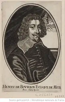 Gaston Henri de Bourbon, Duke of Verneuil (3 November 1601 – 28 May 1682), was the bishop of Metz from 1612 to 1652, despite not being ordained. In his early 50s he was displaced and had a career as a diplomat.