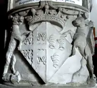 His widow erected in the south aisle chapel of Tawstock Church a large monument to her husband,[lower-alpha 2] deemed "splendid" by Pevsner,[21] "massive and ugly" by Hoskins[22] and "almost unequalled in singularity and absurdity" by Marland.[23] It consists of a free standing base of black and white marble on which sit four white marble dogs supporting on their shoulders a big black square bulging sarcophogus. On each of the four corners is a black obelisk.[21] On the sides of the base is a lengthy epitaph in Latin.[24]