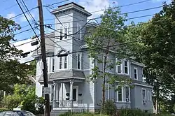The Henry C. Hall House is a historic house at 107 Crescent Street in Waltham, Massachusetts. This 2+1⁄2-story wood-frame house was built c. 1872–74 by Henry Hall, co-owner of a local pharmacy. The house has a mansard roof characteristic of the Second Empire style, with a 3+1⁄2-story tower topped by a truncated hip roof. The cornice of the tower and of the main house are both studded with brackets, as are the skirted roof lines above the building's projecting bays.[2]