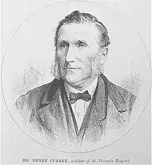 Educated at Dr Pinckney's School at East Sheen and at Eton College, where he rowed in the school eight against Westminster, Currey was articled to the architect Decimus Burton for five years. He then worked for five years at the office of William Cubitt (1791–1863) and Company of Gray's Inn Road, London. His first medical works were for the Surrey Lunatic Asylum, and soon after, in 1847, he was appointed as the architect and surveyor to the governors of St Thomas' Hospital, a post he held until his death.[2] In this post, he designed the new hospital, built in the 'pavilion style',[3] which opened on the Albert Embankment by Westminster Bridge in 1871, including a teaching hospital and a nursing school to a design approved by Florence Nightingale. He was also the architect and surveyor to Coram's Foundling Hospital and to the Magdalen Hospital in London.