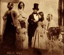 The distinctive curls identify Talbot's half sister Henrietta Horatia Fielding standing to his left. Eliza Frayland, the nursemaid at the far left, had come into the family’s employ with the birth of Charles Henry Talbot in 1842. Arranged in the front are Matilda Caroline (later Gilchrist-Clark, age 5); Ela Theresa (age 9); Rosamond Constance Talbot (age 7). The woman at the right is possibly Moore's wife Bessy.[12]
