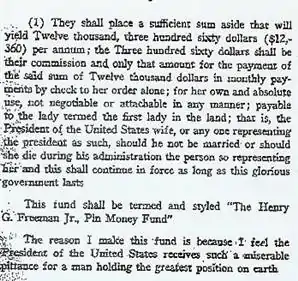 Freeman believed that the president of the United States was paid a "miserable pittance", and that a way of increasing his income while avoiding the appearance of political gifts was to institute an annuity of $12,000 per year to be paid "to the lady termed the first lady in the land; that is, the President of the United States [sic] wife, or anyone representing the president as such, should he not be married or should she die during his administration." Freeman's will specified that the money be for the first lady's "own and absolute use" and the payments "shall continue in force as long as this glorious government exists."
