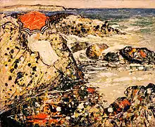 After 1912, he altered his technique and painted with broken colors, changing his subjects from the moody landscapes of Long Island and Montreuil to still life and figurative subjects in a style reminiscent of Adolphe Monticelli.[9] Such a style change was marked by his request to the Metropolitan Museum of Art in 1915 to replace his earlier work with his recent figure painting. Although his late works include portraits and genre subject, his most numerous works of this period were paintings of rock pools in Brittany.[10] The canvases were highly colored; the pigment thickly applied with impressive decorative effect of the compositions. In his final days, Dearth frequently used objects from his substantial collection of Gothic, Renaissance, and Eastern artifacts as his subjects or as backgrounds.[3][4] His final pictures incorporated important Japanese screens, early Chinese paintings, and stone carvings of the Wei period in still life arrangements or as backgrounds for some finely modeled figures.