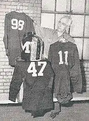 Hatch also began the tradition of retiring jersey numbers at Michigan. The first jersey Hatch retired was the No. 47 jersey worn by Bennie Oosterbaan. After Oosterbaan graduated in the 1920s, Hatch said, "Nobody's ever going to make All-American three years running again. I'm not going to give Bennie's number out."[7] As Tom Harmon finished his playing career at Michigan, Hatch decided Harmon's No. 98 jersey would join Oosterbaan's as the second to be retired. One newspaper reported: "Ol' 98 will be folded carefully and laid away to rest in the Michigan Niche of Fame. That is the decree announced by Henry Hatch, Ann Arbor equipment manager."[8] And when Harmon completed his final game, the United Press reported: "The book was closed on number 98 today, and Equipment Manager Henry Hatch of Michigan university put it reverently away in a musty trunk beside number 47."[9][10] The other of the four original retired numbers (see main image above) are No. 87, which belongs to Ron Kramer and No. 11, which belongs to the Wistert brothers.