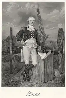 Knox was promoted to major general on March 22, 1782; he became the army's youngest major general.[63] He and Congressman Gouverneur Morris were assigned to negotiate prisoner exchanges with the British. These negotiations failed because the sides could not agree on processes and terms for matching various classes of captives.[64] He joined the main army at Newburgh, New York, and inspected the facilities at West Point, considered a crucial defensive position. After enumerating its defects and needs, Washington appointed him its commander in August 1782. The next month he was devastated by the death of his nine-month-old son, and fell into a depression.[65] He soldiered on, however, becoming involved in negotiations with the Confederation Congress and Secretary of War Benjamin Lincoln over the issue of pensions and overdue compensation for the military. Knox wrote a memorial, signed by a number of high-profile officers, suggesting that Congress pay all back pay immediately and offer a lump-sum pension rather than providing half-pay for life.[66] The unwillingness of Congress to deal with the issue prompted Knox to write a warning letter, in which he wrote "I consider the reputation of the American army as one of the most immaculate things on earth, and that we should even suffer wrongs and injuries to the utmost verge of toleration rather than sully it in the least degree. But there is a point beyond which there is no sufferance. I pray we will sincerely not pass it."[67] When rumors of mutiny in the higher rank circulated in March 1783, Washington held a meeting in which he made an impassioned plea for restraint. In the meeting, Knox introduced motions reaffirming the officers' attachment to Washington and Congress, helping to defuse the crisis.[68] Because of the unresolved issues, however, Knox and others became vigorous proponents of a stronger national government, something which leading political leaders (including Thomas Jefferson, John Hancock, and Samuel Adams) opposed at the time.[69]