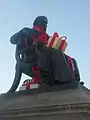 The Henry Wadsworth Longellow Monument occupies a triangular plaza formed at the southeast corner of Congress and State Streets in central Portland. The southeast side of the plaza is occupied by One Longfellow Square. The monument consists of a bronze statue of Longfellow, as seen late in his life, in a seated position, which is mounted on a granite pedestal. The pedestal is about 10 feet (3.0 m) in height, and has carved tablets on two sides, decorated with swags and garlands that frame the name "LONGFELLOW". Above these is a frieze band of anthemion and vines, with a cornice above that. The bronze statue is about 7 feet (2.1 m) in height, with Longfellow seated in a chair whose arms end in lion's heads, and a stack of books underneath. Longfellow wears an overcoat, and a cape is draped over his lap and one shoulder. One hand holds a manuscript, while the other is propped on the chair back, while Longfellow gazes at passersby.[2]