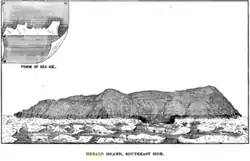 Herald Island (Russian: Остров Геральд, Ostrov Gerald) is a small, isolated Russian island in the Chukchi Sea, 70 km (43 mi) to the east of Waring Point, Wrangel Island. It rises in sheer cliffs, making it quite inaccessible, either by ship or by plane. The only bit of accessible shoreline is at its northwestern point, where the cliffs have crumbled into piles of loose rocks and gravel. Its area is 11.3 km2 (4.36 sq mi) and the maximum height above sea level is 364 m (1,194 ft). The island is unglaciated and uninhabited.