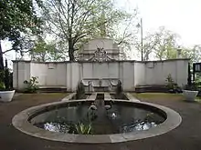 Cheylesmore was honoured Knight Grand Cross of the Order of the British Empire in June 1925.[15] He died a month later aged 77, in a motor accident, the first peer to suffer such a fate in Britain. He was buried in Highgate Cemetery in a grade 2 listed mausoleum designed by the American firm of architects, Carrère and Hastings.[16] The family was desolated and great ballroom, known as the Pillar Hall at Coopers Hill, which was being built for the coming of age of their heir, was left unfinished.[9] He is commemorated by a monument by Sir Edwin Lutyens in Victoria Embankment Gardens, London.[14] The Cheylesmore Range at Bisley named after him was opened for the 1948 Summer Olympics.
