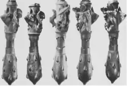 There are two basic types, the smaller type (ca. 3 cm) cast in molds, and the larger (ca. 5 cm) wrought from sheet metal. A type of bone pendants found in Iron Age (Biblical period) Palestine is also associated with the Club-of-Hercules jewelry of the Roman era (Platt 1978). A votive mace made of bronze found in Willingham Fen, Cambridgeshire in 1857 follows the Roman model in shape and the representation of wooden knobs on the club, but adding indigenous (Celtic) iconography by depicting animal heads, anthropomorphic figures and a wheel at the club's base.