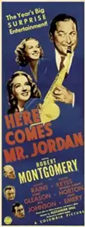 Here Comes Mr. Jordan is a 1941 American fantasy romantic comedy film directed by Alexander Hall, in which a boxer, mistakenly taken to Heaven before his time, is given a second chance back on Earth. It stars Robert Montgomery, Claude Rains and Evelyn Keyes.