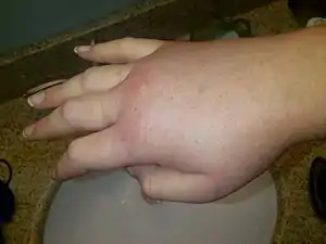 | Swollen right hand during a hereditary angioedema attack. | |