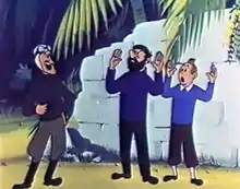 In this version, Max Bird escapes from prison with the help of an accomplice. He participates in the search for the treasure, while he no longer appears after his escape in the comics. Professor Calculus already knows Tintin, even though this is his first appearance in the comic strip. During the trip, Max Bird's accomplice succeeds in stealing the plans that lead to the treasure. Although he is not hard of hearing in this series, Professor Calculus has the time of this episode some hearing problems following the explosion of a failed device. Arrived on the island, Tintin and his friends are attacked by the natives. They continue their research and discover a fetish of Sir Francis Haddock. Thompson and Thomson, who transport it, are kidnapped by the natives, who bear a strong resemblance to the Arumbayas from The Broken Ear. These natives then tried to behead them, as an offering to the fetish, which they consider to be an idol. Captain Haddock hides behind his ancestor's fetish and imitates him, saying he doesn't want this gift. The natives bow and kneel. Tintin takes the opportunity to free the detectives. On the island, Max Bird and his accomplice are on the verge of suppressing Tintin and his friends, but miss their target. It is the fetish which is touched, in the nose. Snowy, hidden behind the two bandits, attacks them. Max Bird's accomplice is caught and questioned. During the excavations in the wreck of The Unicorn, Tintin is attacked by Max Bird, who tries to cut his rope and his air inlet tube. An octopus attacks him, Tintin saves him and it is for Bird the end of the adventure. Haddock had an encounter with shark rather than Tintin. Tintin and his friends return to the island, discover a cross planted by Sir Francis Haddock and think that it indicates the location of the treasure. Their research is in vain. But new worries await them: the natives capture them. They were however abandoned when the natives noticed that a volcano was erupting (similar to Flight 714 to Sydney). They are freed by the Thom(p)sons who, as carriers, were not tied up. The island sinks and everyone is saved in time. Tintin and Captain Haddock discover the treasure in the Hudson Manor (Marlinspike Hall). Max Bird tries to escape with it, but runs into Professor Calculus. Tintin takes the opportunity to disarm him. A fight ensues where Calculus intervenes, knocking out Bird Brother with a painting.