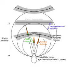 The Hering–Hillebrand deviation describes the mismatch between the theoretical and empirical horopter. The horopter is the set of points that projects at the same location in the two retinae (i.e. that have the same visual direction). Geometrically the horopter is a circle passing through the nodal point of the two eyes and through the fixation point. This is known as the horizontal geometrical horopter, or as the Vieth–Müller circle. This is the set of points that correspond geometrically to the intersection between visual lines at identical eccentricities. There is also a vertical horopter which the a straight line on the sagittal plane and passing through the intersection between the sagittal plane and the Vieth–Müller circle (typically fixation if the observer fixates straight ahead, but not necessarily).[1][2]