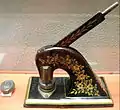Exhibits include a model of a pumping engine made by the engineer-in-charge and dated 1884 from Ford waterworks, Herne Bay Waterworks Company.[6] There is a decorative seal press used by Herne Bay Urban District Council until 1974, which was used to impress the official seal on documents; the accompanying die is dated 1880s.[6] Some exhibits give coverage of Herne Bay's wartime history, and they include a baby's gas mask, dated 1939.[6] Among social history exhibits there is a spinning wheel for wool which is now in disrepair, but its previous repairs reflect the 1950s art-movement revival of spinning and weaving, and that revival features in an exhibit of woven items at Bradford Industrial Museum. This Saxony wheel is accompanied by a lazy kate: a set of spools for hand-plying yarn.[15]