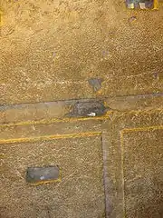 The huge rectangular building blocks, laid in horizontal courses, feature flat, projecting central portions (bosses) surrounded by narrow, shallow dressed margins (“marginal drafts”) creating a finely chiseled, frame-like effect. The depressed “frame” is sunk some 2 centimeters below the smooth face of the stone and its average width is about 8 centimeters. A wide, toothed chisel was used to smooth the stone margins.