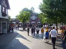 Hersheypark developed a number of themed areas, the first being Carousel Circle, Der Deitsch Platz, and Animal Garden in 1972,[23][24] followed by Tower Plaza in 1975,[25] Pioneer Frontier in 1985, Midway America in 1996,[18] as well as The Boardwalk at Hersheypark in 2007.[26][27] In 2014, Hersheypark merged several theme areas – Tudor Square, Rhineland, Founder's Circle and Music Box Way, became an area called Founder's Way, while the coal mining region themed area Minetown was re-themed as Kissing Tower Hill. The themed areas had featured different music to each area, such as polka-style songs being played in Der Deitsch Platz and Carousel Circle, country music being played in the Pioneer Frontier themed area, the Beach Boys being played near Tidal Force and later in The Boardwalk, as well as Ragtime and jazz music being played in Midway America. However, the music was phased into being the same across the park, except in The Boardwalk and Pioneer Frontier. In the summer of 2020, Hersheypark opened a new themed area called Hershey's Chocolatetown, which included a new entrance plaza, ice cream parlor, flagship retail store, and a Bolliger & Mabillard hyper coaster named Candymonium.[28] This includes the first ever Starbucks inside the park.[29]