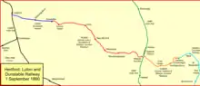 The Hertford, Luton and Dunstable Railway was a railway affiliated to the Great Northern Railway. It was formed when the Hertford and Welwyn Junction Railway (opened 1858) merged with the Luton, Dunstable and Welwyn Junction Railway, partly opened in the same year. The merger and change of title took place in 1860. The line joined the Dunstable branch of the London and North Western Railway at Dunstable.