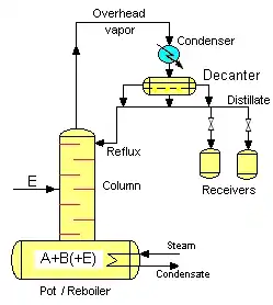 Batch heteroazeotropic distillation is an efficient method for the separation of azeotropic and low relative volatility (low α) mixtures. A third component (entrainer, E) is added to the binary A-B mixture, which makes the separation of A and B possible. The entrainer forms a heteroazeotrope with at least one (and preferably with only one (selective entrainer)) of the original components. The main parts of the conventional batch distillation columns are the following: - pot (include reboiler) - column - condenser to condense the top vapour - product receivers - (entrainer fed) In case of the heteroazeotropic distillation the equipment is completed with a decanter, where the two liquid phases are split.
