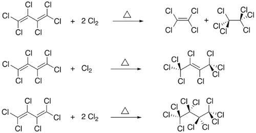 The products of chlorinolysis reactions heavily depend upon both the temperature and pressure under which the reaction occurs. Thus, by adjusting these reaction conditions in the presence of chlorine gas, hexachlorobutadiene can be even further chlorinated to give tetrachloroethylene, hexachloroethane, octachlorobutene, and even decachlorobutane. In general, increasing the number of chlorine substituents on a compound increases its toxicity but decreases its combustibility. Chlorination via carbon skeleton cleavage is thermodynamically preferred, whereas chlorinated C4 products are favored at lower temperatures and pressures. The three chlorinolysis products of hexachlorobutadiene are shown in the reactions below.[3]