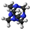 The molecule has a tetrahedral cage-like structure, similar to adamantane. Four vertices are occupied by nitrogen atoms, which are linked by methylene groups. Although the molecular shape defines a cage, no void space is available at the interior for binding other atoms or molecules, unlike crown ethers or larger cryptand structures.