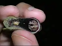 Hexastylis arifolia flower, cut to reveal the internal structures.
