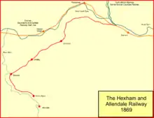 The independently promoted Border Counties Railway ran north from Hexham, connecting mineral deposits to the main line as well as harbouring strategic plans to reach further, which it later achieved. The first part opened in 1858.[1][2]