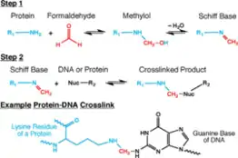 Cell and nuclear membranes are highly permeable to formaldehyde.[4][14][15] Formaldehyde cross-linking is frequently employed for the detection and quantification of DNA-protein and protein-protein interactions.[14] Of interest in the context of Hi-C, and all 3C-based methods, is the ability of formaldehyde to capture cis chromosomal interactions between distal segments of chromatin.[1][4][14][15] It does so by forming covalent links between spatially adjacent chromatin segments. Formaldehyde can react with macromolecules in two steps: first it reacts with a nucleophilic group on a DNA base for example, and forms a methylol adduct, which is then converted to a Schiff base.[14] In the second step, the Schiff base, which can decompose rapidly, forms a methylene bridge with another functional group on another molecule.[14] It can also make this methylene bridge with a small molecule in solution such as glycine, which is used in excess to quench formaldehyde in Hi-C.[1][4][14][15] Quenchers can typically exert an effect on formaldehyde from outside the cell.[14] A key feature of this two-step formaldehyde crosslinking reaction is that all the reactions are reversible, which is vital for chromatin capture.[1][4][14][15]