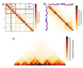 Cis/trans interactions are one of the two strongest interaction patterns observed in Hi-C maps.[26] They are not locus-specific, and thus are considered as a genome-level pattern.[26] Typically, a higher interaction frequency is observed, on average, for pairs of loci residing on the same chromosome (in cis) than pairs of loci residing on different chromosomes (in trans).[26] In Hi-C interaction matrices, cis/trans interactions appear as square blocks centered along a diagonal, matching individual chromosomes at the same time.[26] Because this pattern is relatively consistent across different species and cell types, it can be used to assess the quality of the data. A noisier experiment, due to random background ligation or any unknown factor, will result in a lower cis to trans interaction ratio (as the noise is expected to affect both cis and trans interactions to a similar extent), and high-quality experiments typically have a cis/trans interaction ratio between 40 and 60 for the human genome.[26]