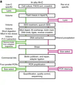 First described by Rao et al., in situ Hi-C combines standard Hi-C with nuclear ligation assay, i.e., proximity ligation performed in intact nuclei.[13][20] The protocol is similar to standard Hi-C in terms of the basic workflow outline but differs in other ways.[13] In situ Hi-C requires 2 to 5 million cells compared to the ideal 20 to 25 million required for standard Hi-C and it requires only 3 days to complete the protocol versus 7 days for standard Hi-C.[13] Furthermore, proximity ligation does not take place in solution like in standard Hi-C, decreasing the frequency of random, biologically-irrelevant contacts and ligations, as indicated by the lower frequency of mitochondrial and nuclear DNA contacts in captured biotinylated DNA.[13] This is achieved by leaving the nuclei intact for the ligation step.[13] Cells are still lysed with a buffer containing Tris-HCl at pH 8.0, sodium chloride, and the detergent IGEPAL CA630 before ligation, but instead of homogenization of the cell lysate, cell nuclei are pelleted after initial lysis to degrade the cell membrane.[13] After proximity ligation is complete, cell nuclei are incubated for at least 1.5 hours at 68 degrees Celsius to permeabilize the nuclear membrane and release its nuclear contents.[13]