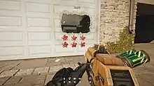 In Rainbow Six Siege, Hibana is a light-armoured attacking operator who is equipped with the "X-Kairos", a 40 mm calibre launcher that fires six explosive pellets simultaneously that can be remotely detonated from a safe distance.[25] The launcher can be used to blow open holes in walls, creating either sightlines or entry points depending on how the player uses it.[26]