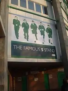 Hibs' most successful era was in the decade following the end of the Second World War, when it was "among the foremost clubs in Britain".[11] The forward line of Gordon Smith, Bobby Johnstone, Lawrie Reilly, Eddie Turnbull and Willie Ormond, collectively known as the Famous Five, was "regarded as the finest ever seen in Scottish football".[11] Each of the Famous Five scored more than 100 goals for Hibs.[11] The north stand at Easter Road is now named in their honour. Smith was signed by Hibs in 1941, while Ormond, Turnbull, Reilly and Johnstone were all signed during 1946. Of the five, only Ormond cost Hibs a transfer fee, £1200 from Stenhousemuir.[26] Reilly, Johnstone, Smith and Turnbull were all signed from youth or junior leagues.[11][27]