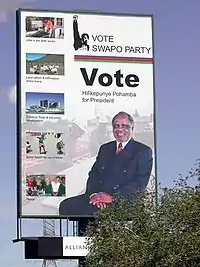 Although there was speculation that Nujoma would seek re-election as SWAPO President in 2007 and then run for President of Namibia again in 2009, he denied these rumours in early October 2007, saying that he intended to step down as party leader in favour of Pohamba.[16][17] On 29 November 2007, Pohamba was elected as SWAPO President at a party congress; he was the only candidate to be nominated and no voting was deemed necessary. Nujoma said that he was "passing the torch and mantle of leadership to comrade Pohamba".[18] The congress also chose Pohamba as the party's only candidate for the 2009 presidential election.[19][20]