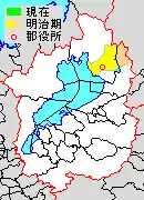 Map of Higashiazai District with Meiji period (1890) area in yellow.