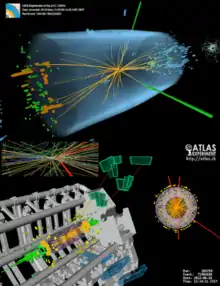 ![]() Candidate Higgs boson events from collisions between protons in the LHC. The top event in the CMS experiment shows a decay into two photons (dashed yellow lines and green towers). The lower event in the ATLAS experiment shows a decay into four muons (red tracks).[lower-alpha 1] | |