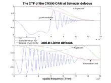 where umax is the maximum transmitted spatial frequency. For the CM300 with an information limit of 0.8 Å Lichte defocus lies at −272 nm.