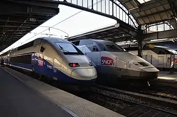 SNCF is the main high-speed train operator in France, with its main brand TGV inOui, as well as its low-cost brand Ouigo Grande Vitesse. It uses a variety of TGV type trains, from the original TGV Sud-Est, introduced in 1981, to the TGV 2N2 "Euroduplex", in 2011.