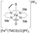 Tetramethylcyclam oxoiron(IV) is formed by the reaction of FeII(TMC)(OTf)2, TMC = 1,4,8,11-tetramethyl-1,4,8,11-tetraazacyclotetradecane; OTf = CF3SO3, with iodosylbenzene (PhIO) in CH3CN at -40 ˚C. A second method for formation of cyclam oxoiron(IV) is reported as the reaction of FeII(TMC)(OTf)2 with 3 equivalents of H2O2 for 3 hours. This species is pale green in color and has an absorption maximum at 820 nm. It is reported to be stable for at least 1 month at -40 ˚C. It has been characterized by Mössbauer spectroscopy, ESI-MS, EXAFS, UV-vis, Raman spectroscopy, and FT-IR.[5]