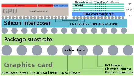 The larger number of connections to the memory, relative to DDR4 or GDDR5, required a new method of connecting the HBM memory to the GPU (or other processor).[13] AMD and Nvidia have both used purpose-built silicon chips, called interposers, to connect the memory and GPU. This interposer has the added advantage of requiring the memory and processor to be physically close, decreasing memory paths. However, as semiconductor device fabrication is significantly more expensive than printed circuit board manufacture, this adds cost to the final product.