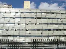 The building that now houses the school was built in 1959 by the architectural firm of Kelly & Gruzen (now known as Gruzen Samton Architects) and is one of the best known structures designed utilizing a vigorous display of the international architectural style movement in the city.[1] It was also the first high school in the city to have escalators.[2] The school is home to a mural, located at its main entrance, that was designed by Hans Hofmann, one of the leading artists of the Abstract Expressionist movement.[3] The building is located on West 49th Street between 9th and 10th Avenues.