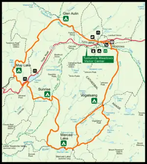 The camp is located 7.2 miles (11.6 km) south of Tuolumne Meadows Lodge, and 7.6 miles (12.2 km) northeast of the Merced Lake High Sierra Camp by the Fletcher Creek Trail. An alternate route, which crosses Vogelsang Pass at 10,480 feet (3,190 m)[13] and then takes the Lewis Creek Trail to Merced Lake, is 8.4 miles (13.5 km).