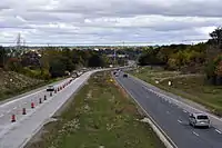 Proceeding north, Highbury Avenue curves northwest as it crosses Highway 401 at Exit 189. North of that interchange, the opposing carriageways separate as Highbury Avenue transitions into a controlled-access highway. It curves back northward parallel to and east of high-voltage transmission lines before encountering an interchange with Bradley Avenue.[6][7] It continues, sandwiched between the established neighbourhood of Pond Mills and the developing neighbourhood of Summerside, to an interchange with Commissioner's Road.[11][12] It then begins to descend into the Thames River valley as it travels west of the Meadowlily Nature Preseve.[13]