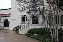 The Highland Park Town Hall houses municipal services. The first floor houses the general administrative offices, the Building Inspection Department, the Engineering Department, and the Utility Billing and Customer Service Department. The second floor houses the Town Council Chambers, the Finance Department, and Municipal Court. The Spanish Colonial architecture building was designed by architects Otto Lang and Frank Witchell. The Highland Park Department of Public Safety and the Highland Park Public Library are adjacent to the town hall.[17] The town council authorized the purchasing of a fire engine and the construction of a fire house after the 1913 incorporation. The town hall was built in 1924. During the same year, a new fire station opened next to town hall. As time passed, the town hall received several renovations. One connected the town hall to the public safety building. In 2003 a portion of the public safety building was razed, and a new facility was built in its place.[17]