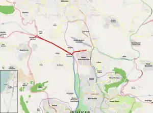 In the late 1990s, the Israel Ministry of Transport planned to construct Highway 45 from Highway 1 near Ben Gurion International Airport through the West Bank north of the Modi'im Stream passing slightly north of Beit Horon and Beit Ur al-Fauqa to the Atarot Industrial Park in Jerusalem.[3][4] The current Route 443 just south of these towns as well as political considerations has made that plan irrelevant,[5] leaving the small portion of Highway 45 between Giv'at Zeev and Atarot completed in 2003.[6] Excavations in the hillsides performed in the 1990s can still be seen just northwest of Givat Ze'ev junction.[7]