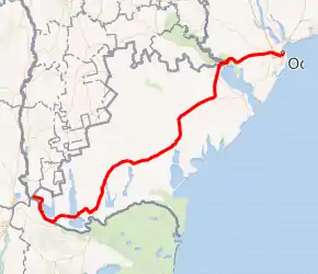 The highway crosses the border with Moldova twice and west of the city of Reni it continues as Moldovan national road M3.[2] The highway also passes the Moldovan village Palanca, Ștefan Vodă where Ukraine has jurisdiction on the road.