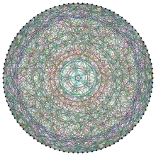In mathematical graph theory, the Higman–Sims graph is a 22-regular undirected graph with 100 vertices and 1100 edges. It is the unique strongly regular graph srg(100,22,0,6), where no neighboring pair of vertices share a common neighbor and each non-neighboring pair of vertices share six common neighbors.[2] It was first constructed by Mesner (1956) and rediscovered in 1968 by Donald G. Higman and Charles C. Sims as a way to define the Higman–Sims group, a subgroup of index two in the group of automorphisms of the Higman–Sims graph.[3]