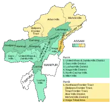 There continued to be sometimes violent struggles in the new hill states between non-tribal and tribal communities.[29] Various attempts were made to resolve the often-violent struggles between the state and the hill tribes through accords, with varying degrees of success.[31] Almost all the ethnic groups are dispersed over different locations rather than living in one concentrated area, so a territorial area can only be achieved by redrawing boundaries and disenfranchising some of the residents.[32] Most peace accords guarantee cultural rights and include provisions for the rebels to disarm and receive assistance in returning to civilian life. Often the surrender and disarmament have been incomplete, while the guarantees of cultural rights have not been fully implemented, or may have harmed other groups. The accords generally establish a system of representation on a territorial or ethnic basis.[33] Often the accords have tended to decrease or destroy the authority of the signatory organization, which would then be replaced by more militant groups that were not part of the accord. This pattern has been seen in Nagaland, Manipur (Nagas), Assam (Bodo plains tribe) and Tripura.[34]