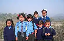 As of 2011 the state population was 1,978,000.[64] Nagaland is one of three states in India where the population is mostly Christian, the others being Meghalaya and Mizoram.[65] The people of Nagaland, collectively called Naga, are in fact a number of very different tribes with mutually incomprehensible languages.[66] Nagaland is home to 16 tribes: Angami Naga, Ao Naga, Chakhesang Naga, Chang Naga, Khiamniungan, Konyak, Lotha Naga, Phom, Pochury, Rengma Naga, Sangtam Naga, Sumi Naga, Yimkhiung, Zeme-Liangmai (Zeliang), Dimasa Kachari and Kuki.[67] There are also members of the Rongmei Naga. Each tribe has distinct customs, language and dress.[67]